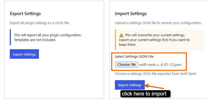 The Import Settings option allows you to restore or apply Swift Rank settings from a previously exported JSON file.
